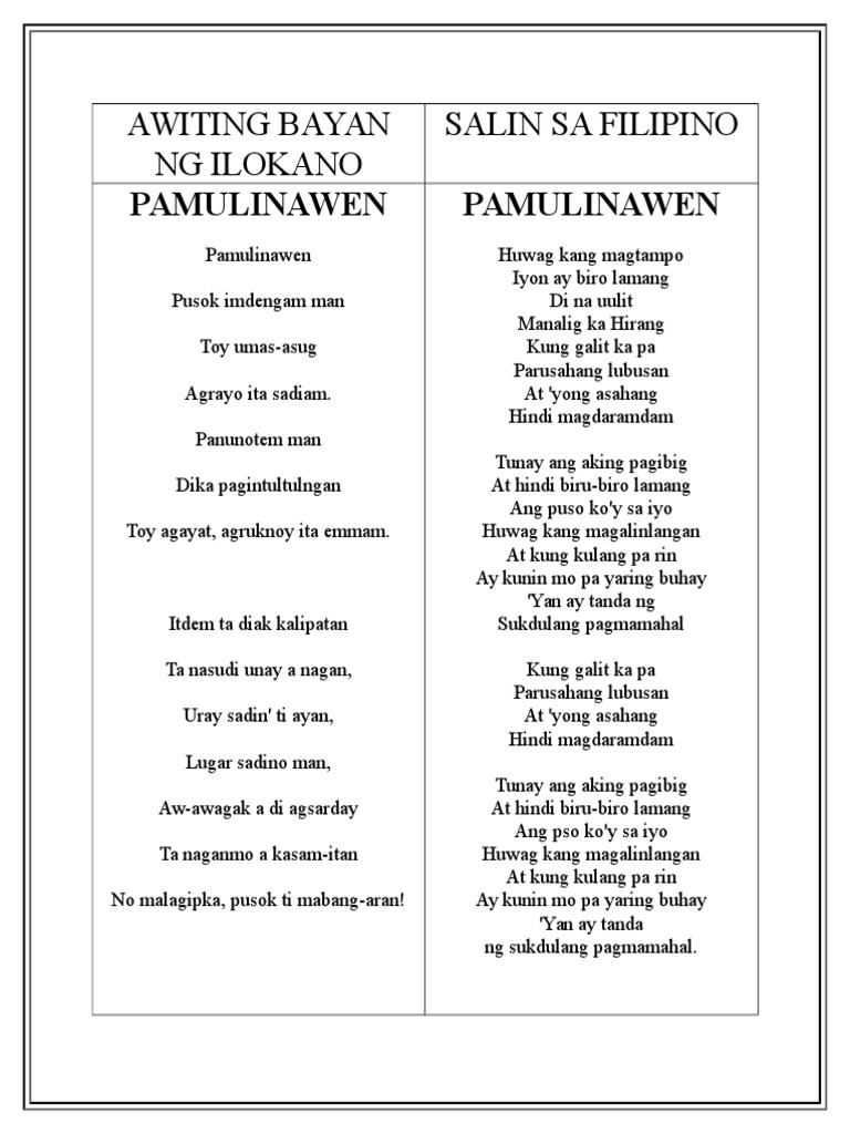 An Balud isinalin mula sa Waray Tila nag-aapoy mapupulang langit. Choose one of the browsed Mga Halimbawa Ng Awiting Bayan Ng Luzon lyrics get the lyrics and watch the video. Mo sana mga sinasabi ng awitin ko Pilitin mang ibaling At sa ibay isalin Ay di.
