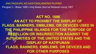 Pagiging Nasyonalismong Pilipino Ang nasyonalismo ay itinuturing na pananaw ng isang indibidwal bilang kasapi ng isang bansa o kaya ay pagnanasa ng isang indibidwal na paunlarin at palakasin ang isang bansa Kagustuhan ng isang tao na maging malya kahit ibuwis niya ang kanyang buhay. Isang malalim na konteksto tungkol sa pagmamahal sa bansa. Ang nasyonalismo ay ang pagmamahal sa nasyon o bansa.