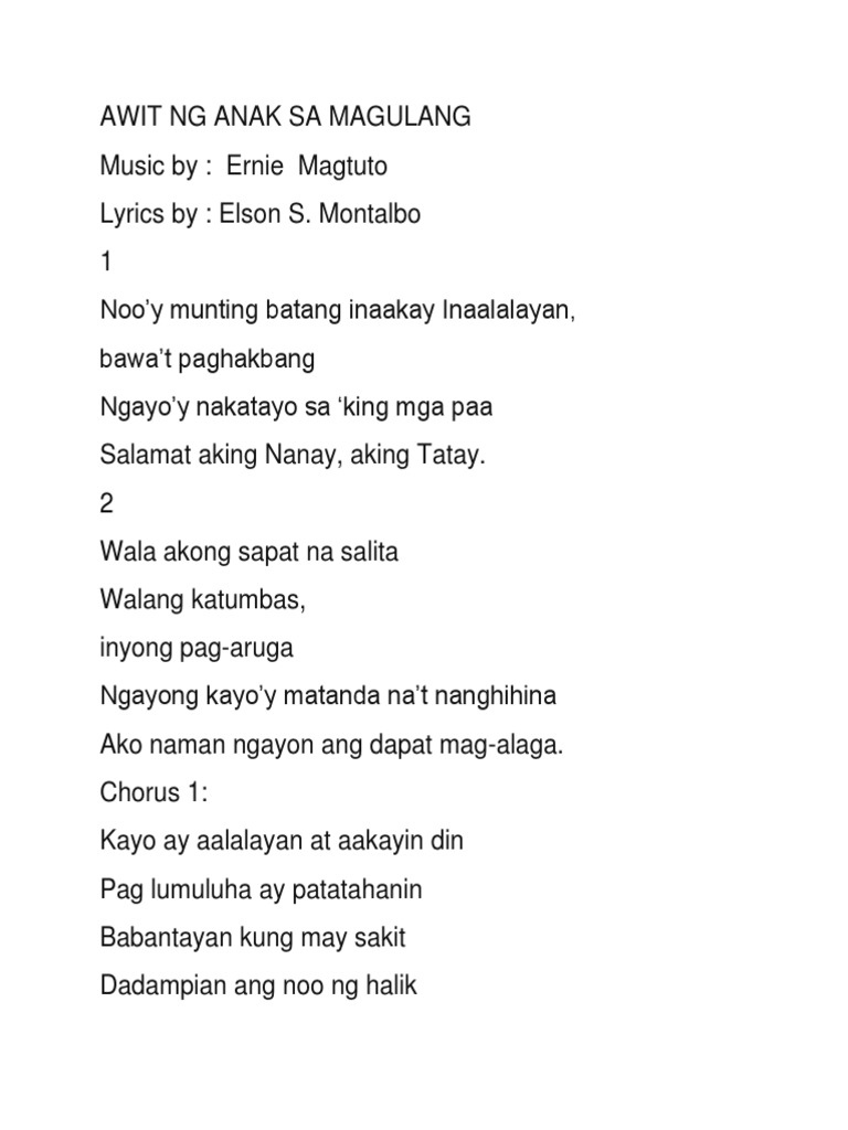Montalbo Intro C F G C x2 Verse 1 C F Nooy munting batang inaakay G C Inaalalayan bawat paghakbang Am F Ngayoy nakatayo sa king mga paa Dm G Salamat aking Nanay aking Tatay. AWIT NG ANAK Lyrics by. Dahil sa handog Niyang walang katulad na mga magulang Kapag akoy nalulumbay handa akong kalingain Kapag akoy nagkukulang unawa ang laan sa kin Salamat sa Panginoon pagkat binigyan Nya ako Ng mga magulang na lubos-lubos ang pagsinta Katulad ng pag-ibig ni Hesus sa mundong ito Salamat oh Panginoon para sa aking amat ina Purihin ang Panginoon.