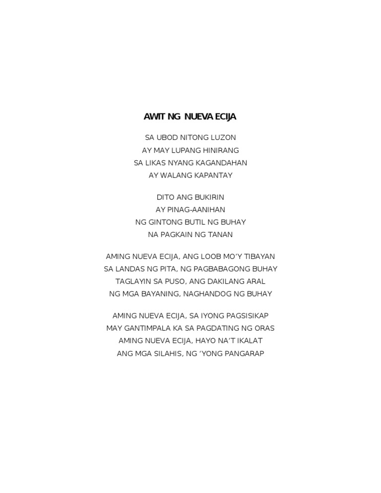 AWIT NG NUEVA ECIJA. Awit Ng Wikang Pambansa Tagalog lyrics. The chorus lyrics are.