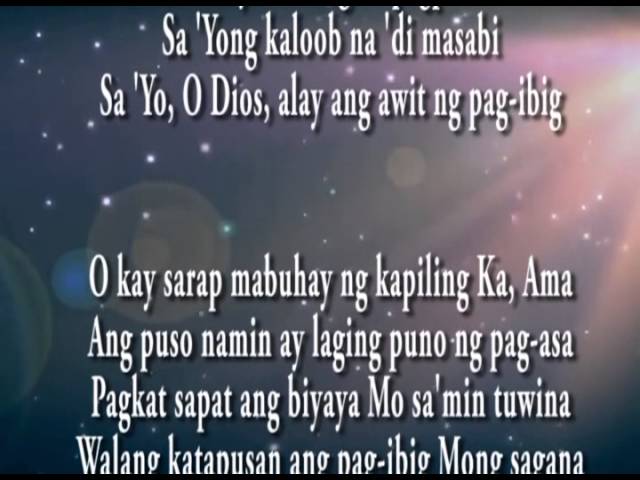 Dahil sa handog Niyang walang katulad na mga magulang Kapag akoy nalulumbay handa akong kalingain Kapag akoy nagkukulang unawa ang laan sa kin Salamat sa Panginoon pagkat binigyan Nya ako Ng mga magulang na lubos-lubos ang pagsinta Katulad ng pag-ibig ni Hesus sa mundong ito Salamat oh Panginoon para sa aking amat ina Purihin ang Panginoon. Pakinggan mo ang awit ko Awit ng pag-ibig alay ko sayo Mula sa puso ko hanggang sa puso mo Nag-uugnay sa pag-ibig nating totoo. Ngayong batid ko na ang umibig.