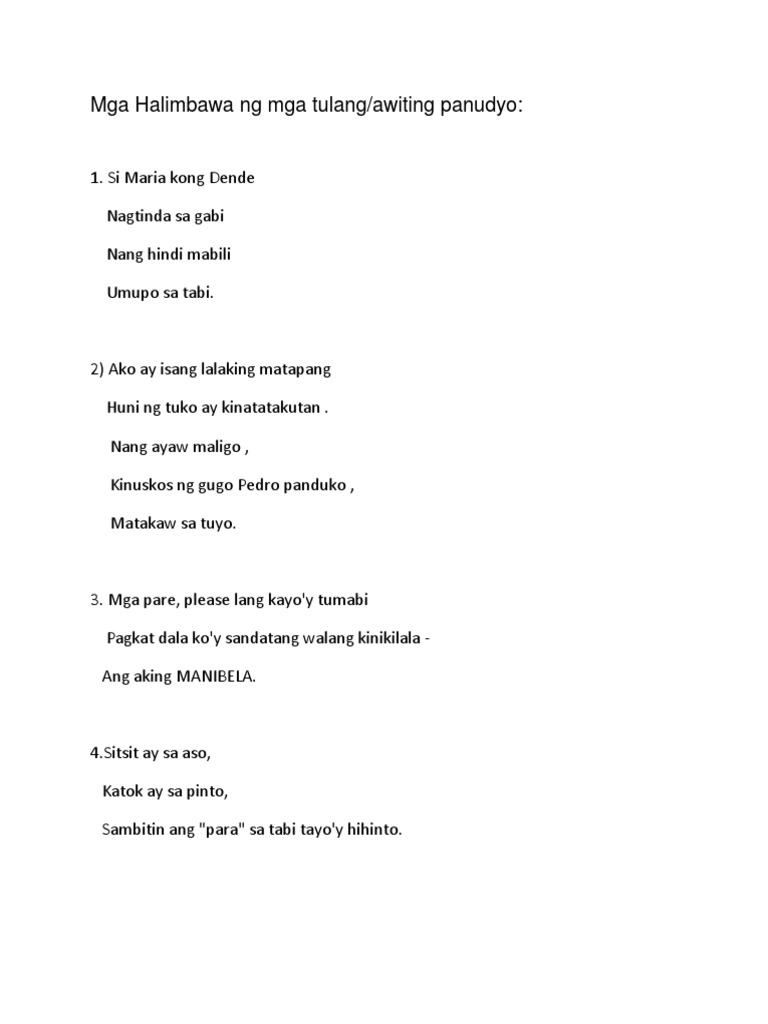 Gayunpaman ang mga tulang ito ay hindi dapat damdamin o kaya ay bigyan ng malalim na kahulugan sapagkat ang pangunahing layunin lamang nito ay magpasaya o magpatawa. Si Maria kong Dende Nagtinda sa gabi Nang hindi mabili Umupo sa tabi 2 Ako ay isang lalaking matapang Huni ng tuko ay kinatatakutan. Nagbibigay na Sinasakal pa.