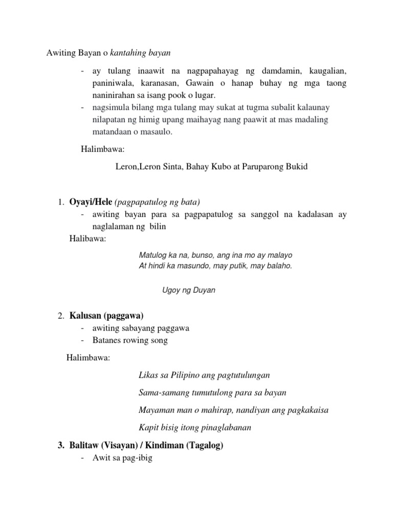 Nalimutan ko na sana may magpost ng kumpletong lyrics. MGA AWITING BAYAN 1. Ito ang kanilang mga katangian.