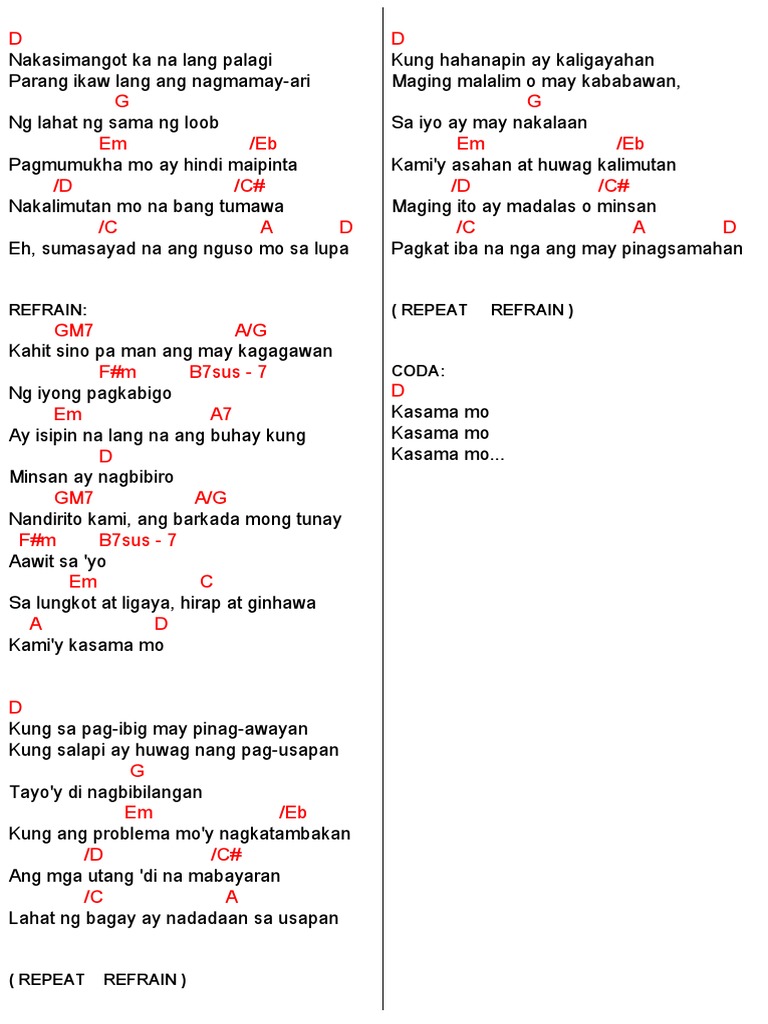 - Guitar Piano Ukulele Transpose MIDI Life is one grand sweet song so start the music Ronald Reagan. List contains Sama sama tayo sa pagsapit ng pasko song lyrics of older one songs and hot new releases. Ng lahat ng sama ng loob Pagmumukha mo ay hindi maipinta Nakalimutan mo na bang tumawa Eh sumasayad na ang nguso mo sa lupa Kahit sino pa man ang may kagagawan Ng iyong pagkabigo Ay isipin na lang na ang buhay Kung minsan ay nagbibiro Nandirito kami ang barkada mong tunay Aawit sa iyo Sa lungkot at ligaya hirap at ginhawa Kamiy kasama mo O ikaw.